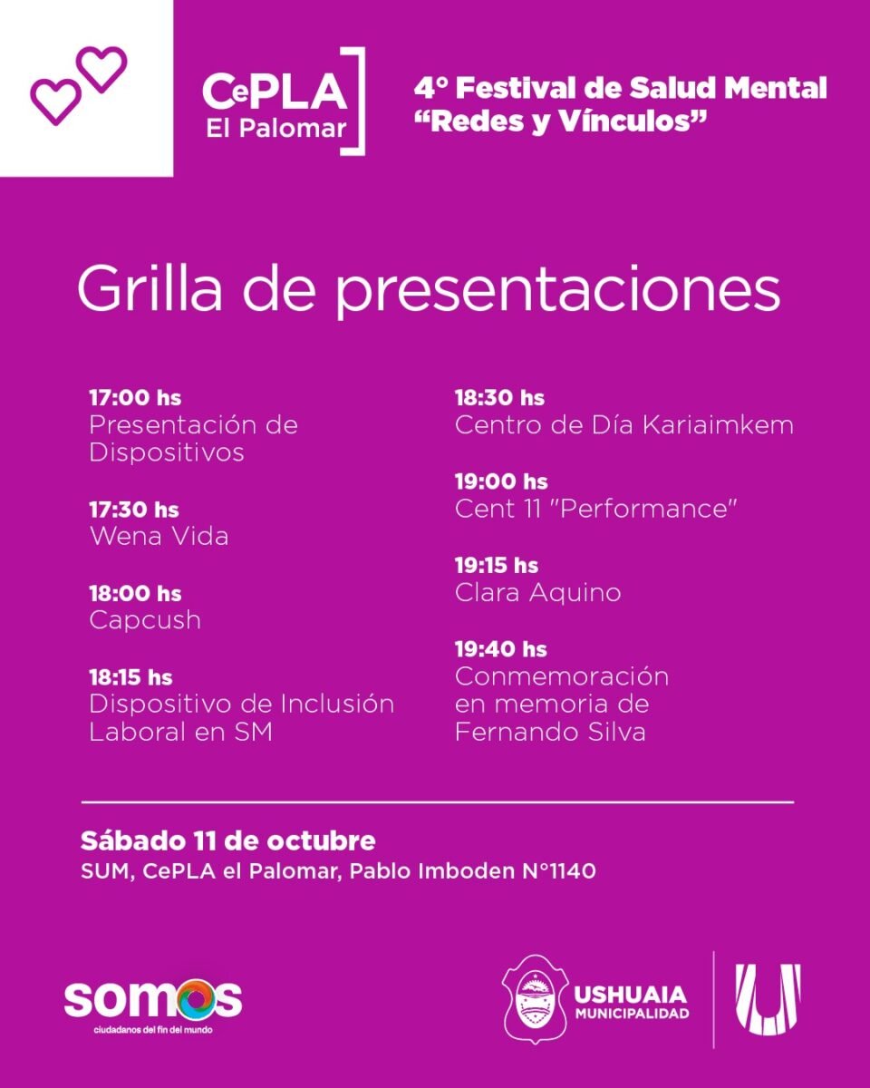 La Municipalidad de Ushuaia invita a participar del 4° Festival de Salud Mental “Redes y Vínculos”, que se llevará adelante el sábado 11 de octubre en el CePLA-El Palomar (Pablo Imboden 1140). La propuesta se desarrollará entre las 17 y las 20 horas, con talleres simultáneos y presentaciones artísticas que buscan promover la salud mental comunitaria a partir del encuentro, la reflexión y la creación colectiva. En el marco de la programación se ofrecerán talleres sobre violencia digital, abordajes comunitarios del padecimiento mental, actividades lúdicas para familias y redes, y propuestas vinculadas al arte y la salud. El festival contará además con una grilla de presentaciones artísticas y comunitarias, entre ellas: Wena Vida, CapcUsh, Dispositivo de Inclusión Laboral en Salud Mental, Centro de Día Kariaimkem, performance del CENT 11 y la cantante Clara Aquino. El cierre estará dedicado a la proyección de un video en conmemoración de la memoria de Fernando Silva. El encuentro se organiza en articulación con diferentes dispositivos de salud mental de la ciudad, el CePLA-El Palomar, dependiente de la Secretaría de Políticas Sociales, Sanitarias y Derechos Humanos, CapcUsh, Centro de Día Kariaimkem (Ministerio de Salud) y el CENT 11 (Ministerio de Educación).