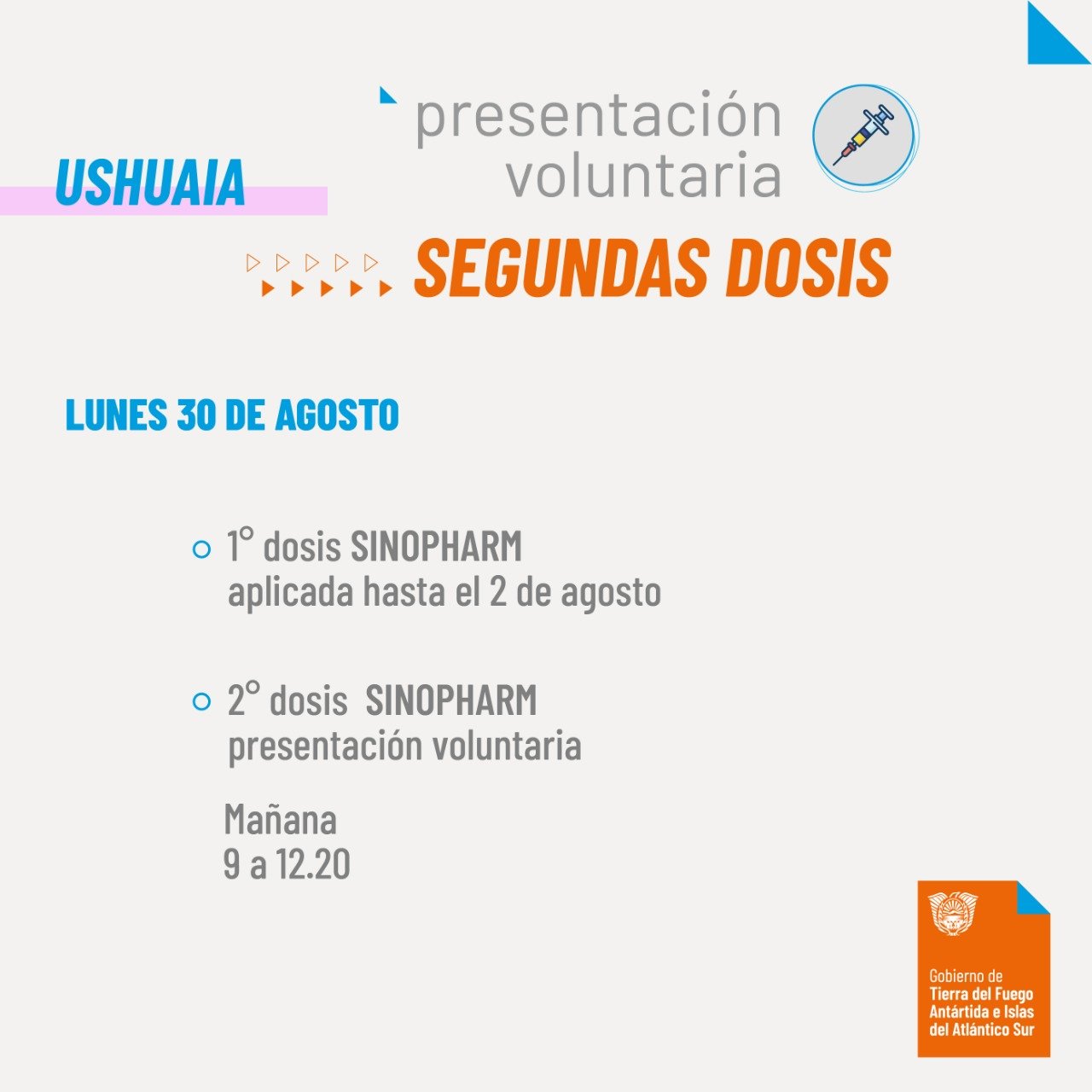 Se convoca durante la mañana (de 9 a 12:20 horas) a quienes se hayan colocado primera dosis de Sinopharm hasta el 2 de agosto, inclusive, para completar esquema con 2° dosis de Sinopharm.