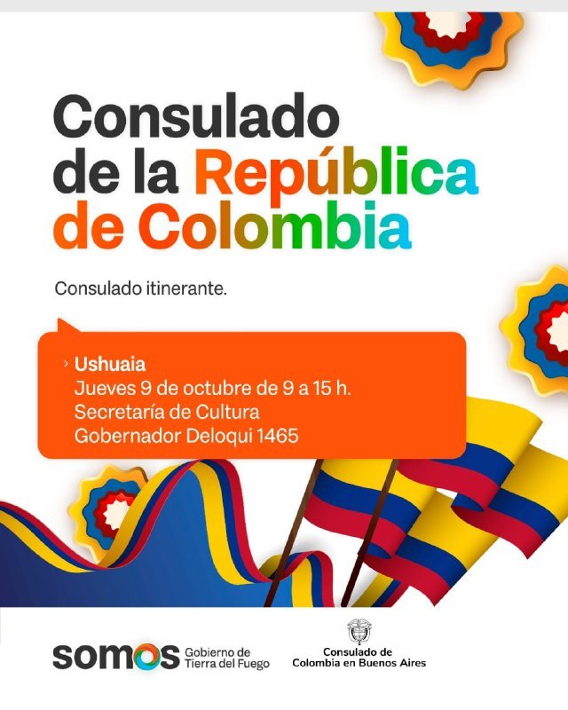 La Secretaría de Malvinas, Antártida, Islas del Atlántico Sur y Asuntos Internacionales del Gobierno provincial informa que el próximo jueves 9 de octubre se realizará una jornada de Consulado Itinerante de la República de Colombia en la ciudad de Ushuaia. La misma se desarrollará en las instalaciones de la Secretaría de Cultura, ubicada en Deloqui 1465, de 09 h. a 15 h. Cabe resaltar que esta acción se desarrolla en coordinación con el Consulado General de Colombia en Buenos Aires y está destinada a vecinas y vecinos colombianos residentes en la provincia que necesiten realizar trámites consulares. Durante la jornada se brindarán, entre otros, los siguientes servicios: expedición de cédulas y pasaportes; autorizaciones de salida de menores; poderes; información sobre apostillas y antecedentes judiciales; fe de vida; entrega de documentos; y consultas generales. Se recomienda concurrir con documentación personal vigente y, en lo posible, revisar con anticipación los requisitos específicos de cada trámite para agilizar la atención. Para consultas previas, las y los interesados pueden escribir al Consulado General de Colombia en Buenos Aires: cbuenosaires@cancilleria.gov.co