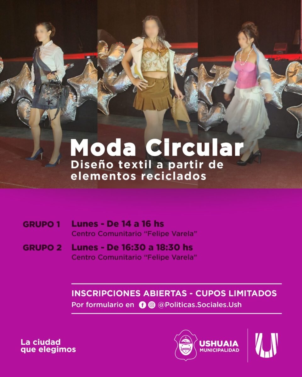 La Municipalidad de Ushuaia, a través de la Secretaría de Políticas Sociales, Sanitarias y Derechos Humanos, invita a los vecinos y vecinas a participar del Taller Municipal de Diseño Circular, una propuesta de formación en diseño textil y moda a partir de elementos reciclados, con enfoque en reciclaje y sustentabilidad. El taller tendrá lugar en el Centro Comunitario Municipal Felipe Varela y contará con dos grupos: el primero, los lunes de 14:00 a 16:00 horas; y el segundo, también lunes en el horario de 16:30 a 18:30 horas. Desde la secretaría municipal destacaron que “el objetivo es brindar herramientas que permitan transformar materiales en desuso en prendas y accesorios, promoviendo la creatividad, la conciencia ambiental y la economía circular en la comunidad”. Cabe mencionar que los cupos son limitados y quienes quieran inscribirse deberán completar el formulario online: https://inscripciones.website/taller-de-moda-circular/ el cual, también se encuentra disponible en las redes sociales del municipio.