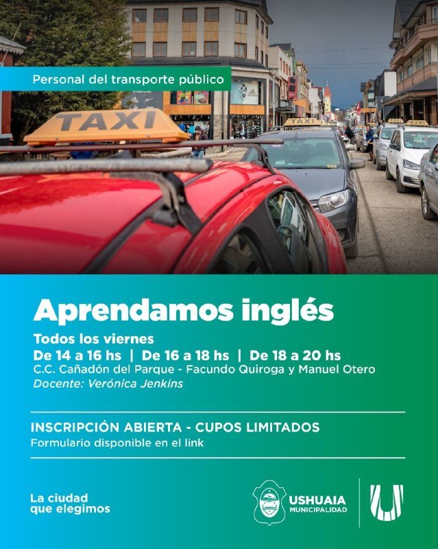 La Municipalidad de Ushuaia, a través de la Secretaría de la Mujer y Desarrollo Humano, llevará adelante la capacitación “Aprendamos Inglés”, destinada al personal del transporte público de la ciudad. La propuesta se desarrollará todos los viernes en el Centro Comunitario Cañadón del Parque, ubicado en la intersección de Facundo Quiroga y Manuel Otero, y contará con tres turnos: de 14 a 16, de 16 a 18 y de 18 a 20 horas. El espacio estará a cargo de la docente Verónica Jenkins y tiene como objetivo brindar herramientas de comunicación, tanto verbal como no verbal, que permitan mejorar la interacción con turistas y fortalecer la calidad del servicio. Las inscripciones se realizarán de manera online a través del siguiente enlace, con cupos limitados: https://inscripciones.website/talleres-de-ingles-para-personal-del-transporte-publico/