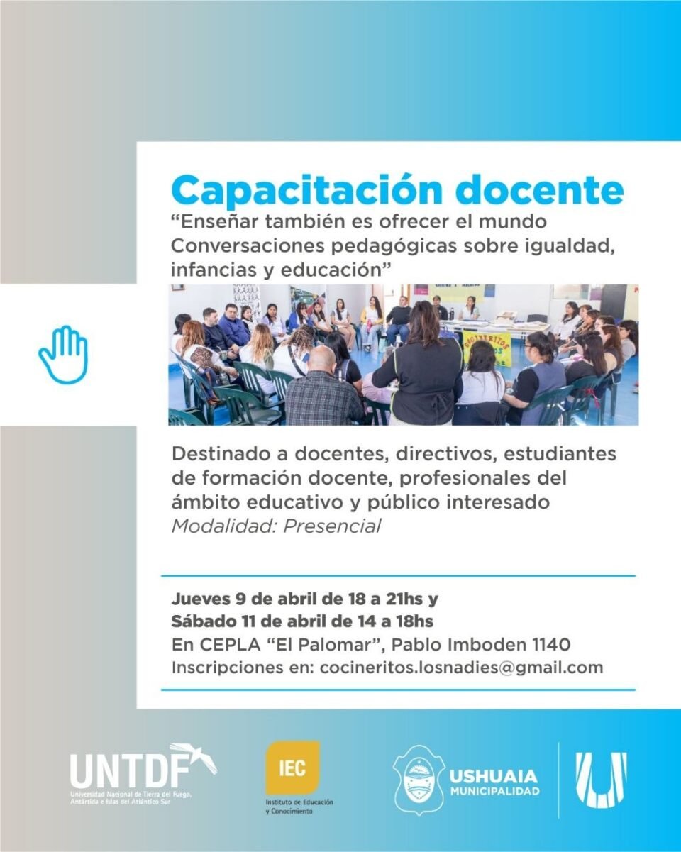 La Secretaría de Políticas Ambientales, Culturales y Educativas de la Municipalidad de Ushuaia impulsará este jueves 9 de abril y sábado 11 en el CEPLA “El Palomar” el Encuentro Internacional “Conversaciones pedagógicas sobre igualdad, infancias y educación”, destinado a docentes, directivos, estudiantes de formación docente, profesionales del ámbito y público interesado. Dicha propuesta, que es impulsada desde el programa de Hábito Lector dependiente de la Subsecretaría de Promoción Educativa, contará con actividades presenciales el día jueves 9 de 18:00 a 21:00 horas y el sábado de 14:00 a 18:00 en Pablo Imboden N° 1140, sede del CEPLA “El Palomar”. Allí, el encuentro convocará a reconocidos especialistas de Madrid, España junto a referentes locales, promoviendo un diálogo sobre las experiencias internacionales y el territorio fueguino. El mismo se realiza en articulación con el Instituto de Educación y Conocimiento de la Universidad Nacional de Tierra del Fuego, quiénes deseen inscribirse podrán hacerlo a través del correo electrónico cocineritos.losnadies@gmail.com.