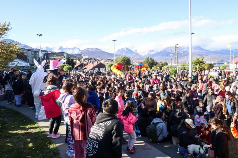 La Municipalidad de Ushuaia, a través de la Secretaría de la Mujer y Desarrollo Humano, llevó adelante la propuesta “Pascuas en la Plaza” en la Plaza Luis Piedrabuena, donde más de 500 vecinos y vecinas participaron de una jornada recreativa pensada para toda la familia. La secretaria de la Mujer y Desarrollo Humano, Verónica Maestro, destacó que “vivimos una hermosa jornada, con un clima muy familiar, con muchos niños y niñas disfrutando de los juegos y actividades propuestas”. En ese sentido, valoró la amplia participación de la comunidad en las distintas propuestas recreativas, entre ellas la kermesse municipal “La vida es una sonrisa”, la búsqueda de huevos y sorpresas de Pascua, y los espacios lúdicos pensados para todas las edades. Durante la tarde, las familias también pudieron disfrutar de un espacio temático para fotografías con una escenografía especialmente diseñada con materiales reciclados, elaborada por los equipos de Barrios y Centros Comunitarios. Además, la calesita de la plaza estuvo en funcionamiento, sumando una de las propuestas más elegidas por los más chicos y chicas. Asimismo, se compartió chocolate caliente entre los presentes, y se contó con la colaboración de la chocolatería Smechen, que realizó la donación de huevos de Pascua, vales para productos y visitas al establecimiento.