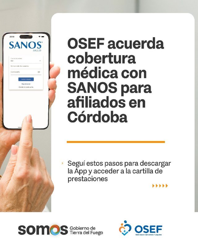 La Obra Social del Estado Fueguino (OSEF) informa que ha establecido un acuerdo con SANOS Salud para brindar cobertura médica a sus afiliados que se encuentren en la provincia de Córdoba. Este convenio tiene como objetivo garantizar el acceso a servicios de salud de calidad, respondiendo a las necesidades de los afiliados en un contexto de complejidad creciente. A partir de ahora, los afiliados de OSEF podrán acceder a la cobertura médica a través de la aplicación de SANOS Salud, donde encontrarán las instrucciones necesarias para utilizar los servicios. En caso de inconvenientes, se ha habilitado el número de contacto (351) 610-6110, correspondiente al área de Afiliaciones de OSEF, para brindar asistencia.