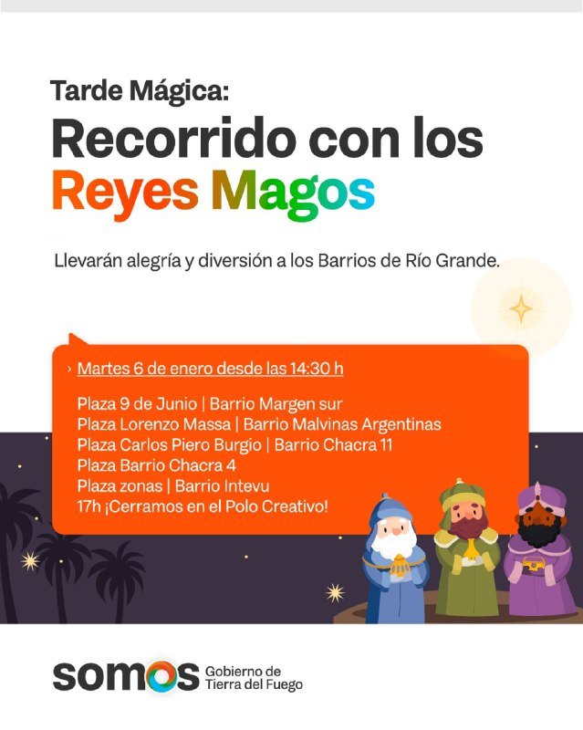 El Gobierno Provincial invita a la comunidad a participar de “Tarde Mágica: Recorrido con los Reyes Magos”, una propuesta de alcance provincial que se desarrollará el martes 6 de enero, con actividades programadas en Ushuaia, Tolhuin y Río Grande. La iniciativa propone llevar la celebración del Día de Reyes a barrios, plazas y espacios públicos de las tres ciudades, generando espacios de encuentro para niñas, niños y familias, y promoviendo una jornada pensada para compartir en comunidad. En Río Grande, el recorrido comenzará desde las 14:30 horas, con visitas a distintos puntos de la ciudad. La propuesta comenzará en la Plaza 9 de Junio del barrio Margen Sur, continuará por la Plaza Lorenzo Massa en el barrio Malvinas Argentinas, la Plaza Carlos Piero Burgio en Chacra 11, la Plaza del barrio Chacra 4 y una plaza de la zona del barrio Intevu. La jornada culminará a las 17 horas con un cierre en el Polo Creativo. En Ushuaia, iniciará a las 15 horas en el barrio Mirador de los Andes y continuando por los barrios Río Pipo y Malvinas Argentinas. El recorrido incluirá además una parada en la Plaza Piedra Buena y finalizará con un recorrido por la Avenida San Martín, permitiendo que familias de distintos sectores de la ciudad puedan sumarse a la propuesta. En Tolhuin, la propuesta tendrá lugar a partir de las 17 horas en el Campo de Doma, donde iniciará el recorrido para compartir alegría y celebración junto a las familias de la localidad.